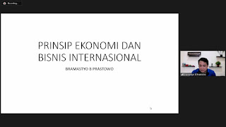 Acara diawali dengan pembukaan oleh moderator. Kemudian Sesi pemberian materi yang disampaikan oleh Pak Bram yang membahas mengenai Latar Belakang ekonomi internasional, Sejarah Perdagangan Internasional, Kerjasama ekonomi internasional, hingga negoisasi perdagangan Indonesia. Acara dilanjutkan dengan sesi Tanya-jawab yang dipandu oleh moderator. Para peserta mendapatkan kesempatan untuk bertanya langsung kepada pemateri mengenai Prinsip Ekonomi dan Bisnis Internasional dan juga topik-topik yang berkaitan dengan tema acara ini. Selanjutnya acara ditutup dengan sesi foto bersama dengan peserta seminar.